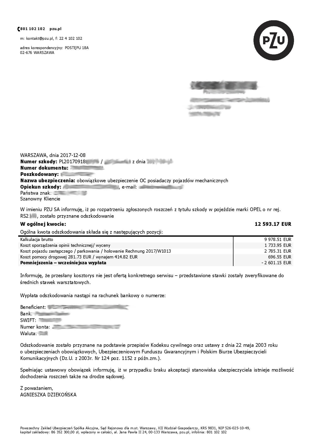 Our Customer contact us, due suspicions underestimated compensation. It’s how PZU evaluated our client car. For obvious reasons all sensitive data are blured.